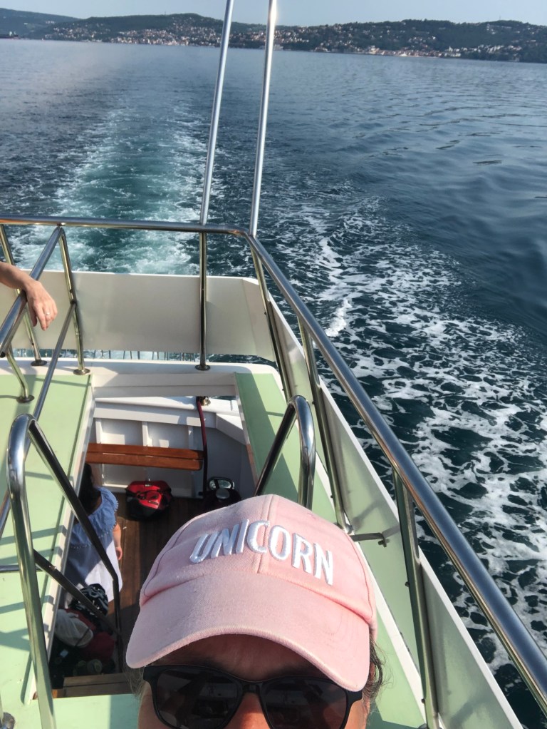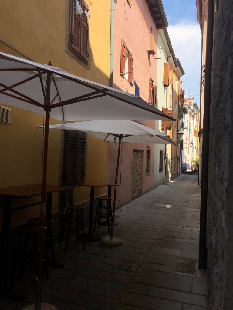 Um diesen Platz herum gibt es Straßen und Gassen mit Geschäften, schöne Läden, kein Schnick Schnack, wir haben lange einen Laden für Postkarten gesucht und nachher erst durch Zufall und in der letzten Minute gefunden. Es geht so ruhig und beschaulich zu, nicht langweilig oder piefig, einfach nur sehr angenehm. So war dann die Bootsfahrt mit dem Küstentaxi rüber nach Muggia (der letzte Küstenort vor der slowenischen Grenze) keine Flucht, sondern einfach nur eine Konsequenz der Nähe zum Meer.