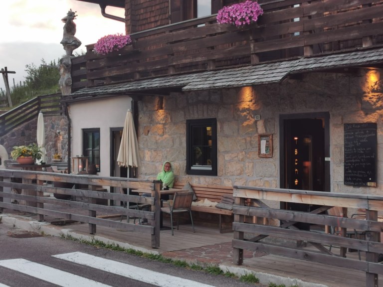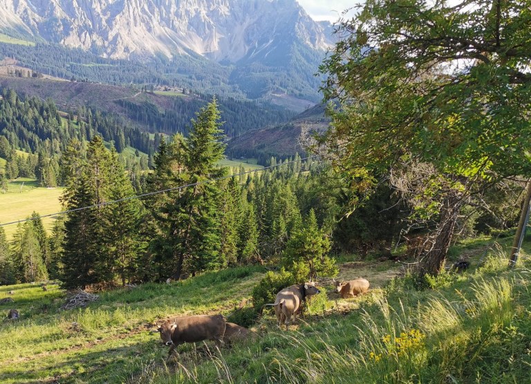 Wir waren etwas zu früh da (wird erst um 18 Uhr geöffnet), so dass wir noch Zeit hatten, die Kühe zu beobachten, die unterhalb der Hütte grasten. Natürlich mit Glocken um den Hals, so ein schönes Geräusch.
