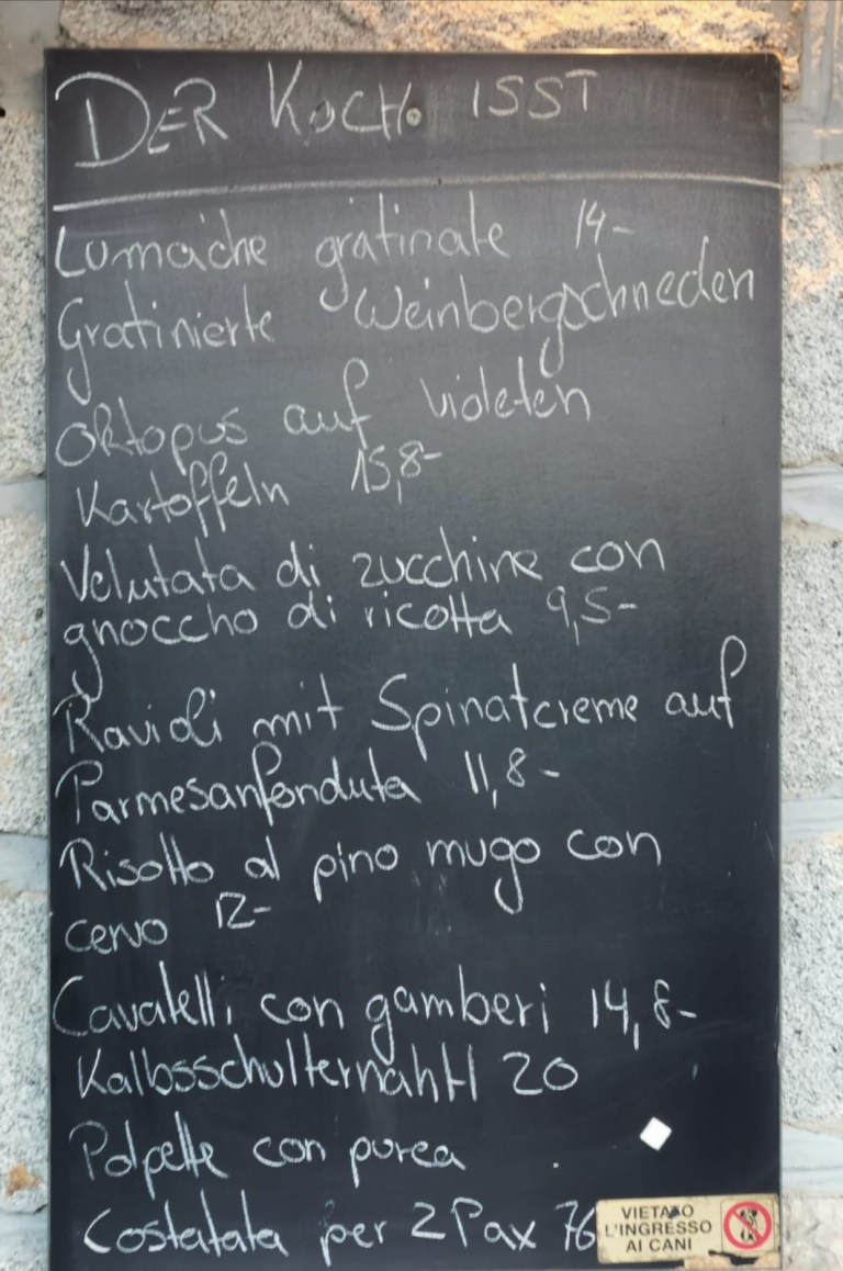 Es gibt keine Speisekarten, nur diese Tafel am Eingang, bzw wird jedem Gast von der netten Bedienung das Menü des Tages aufgesagt, wenn es sein muss auch zwei- oder dreimal.