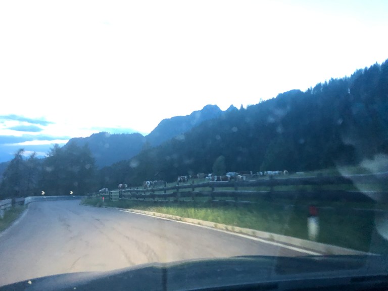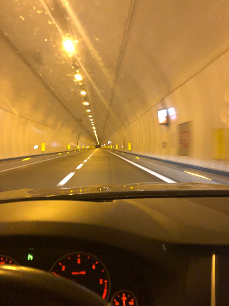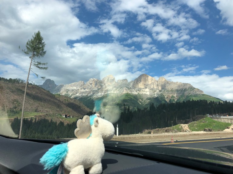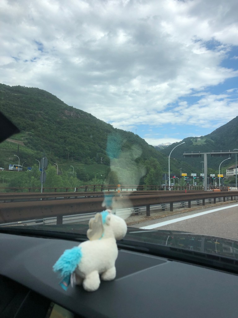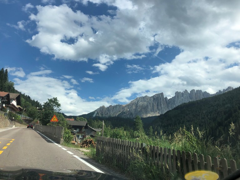 Von dort aus schlängelte sich die Straße durch helle Tunnel und sattes Grün. Und schon von weitem konnten wir schon die Spitzen der Dolomiten erkennen.