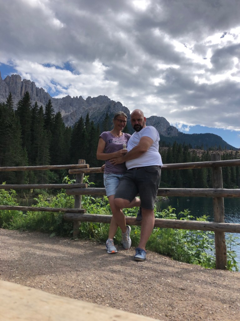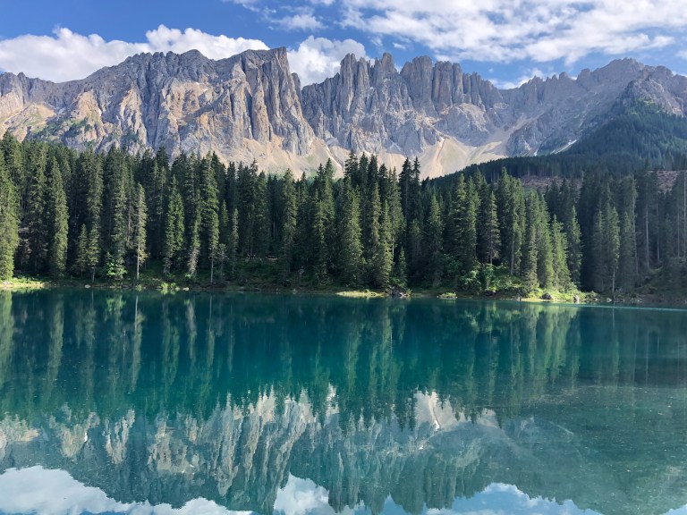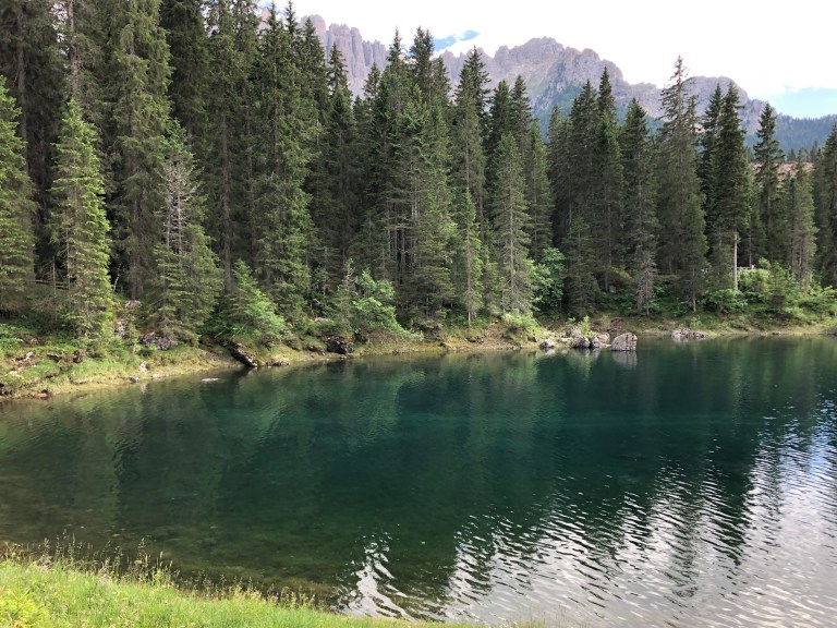 Was für ein imposanter Ort. Der See funkelt förmlich. Schimmert zwischen Blau und Grün und ist dabei unheimlich klar. Und dahinter die Dolomiten.