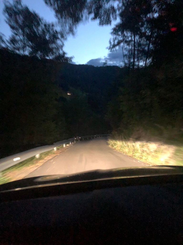 Steil und dunkel ging es ins Tal hinab. Kein Haus, nichts, nur die Bäume und links das Tal, in das wir immer weiter „hineingesaugt“ wurden. Es war schon ziemlich gruselig. Ich habe schon ein bisschen (mehr) Angst gehabt…..